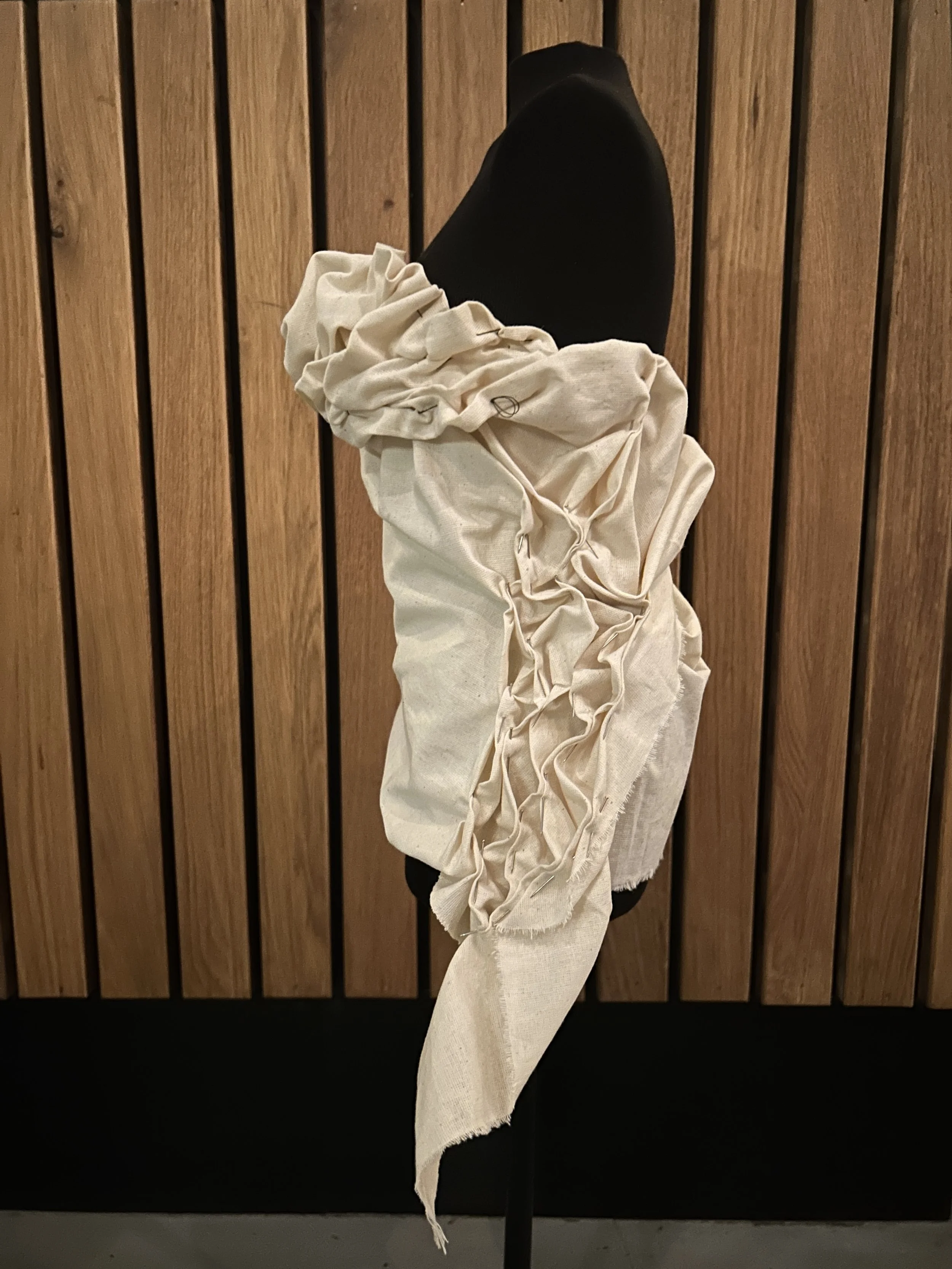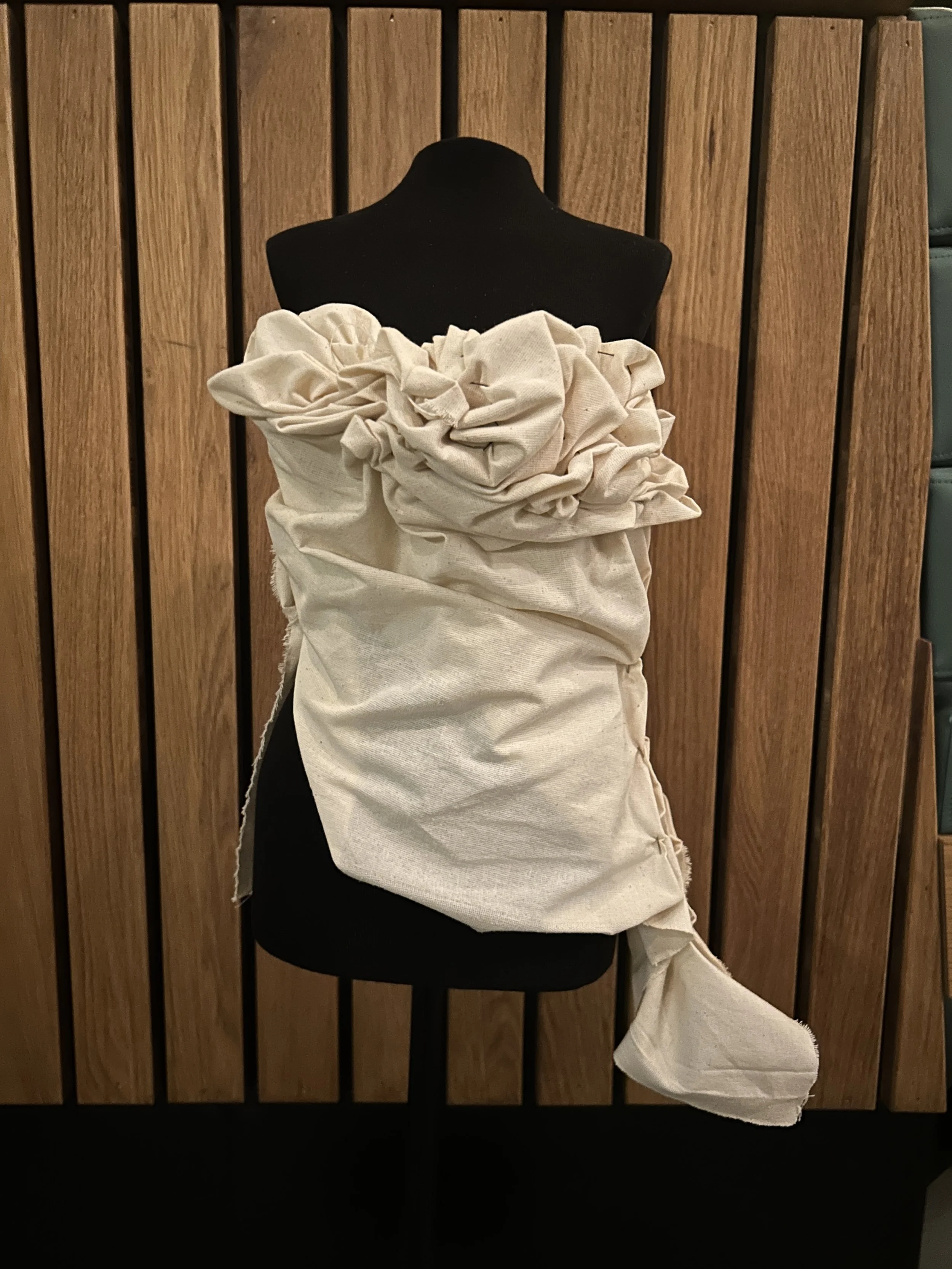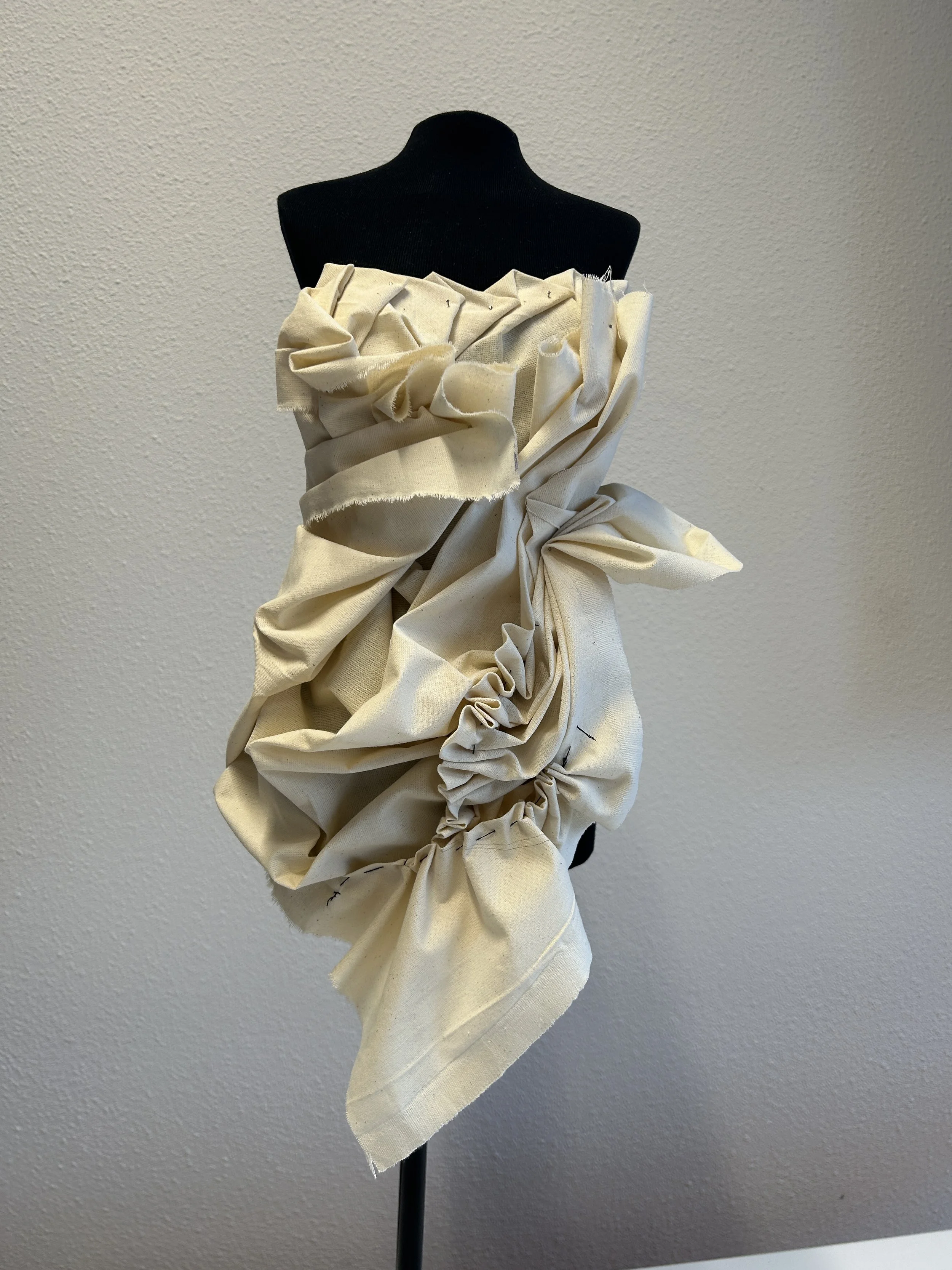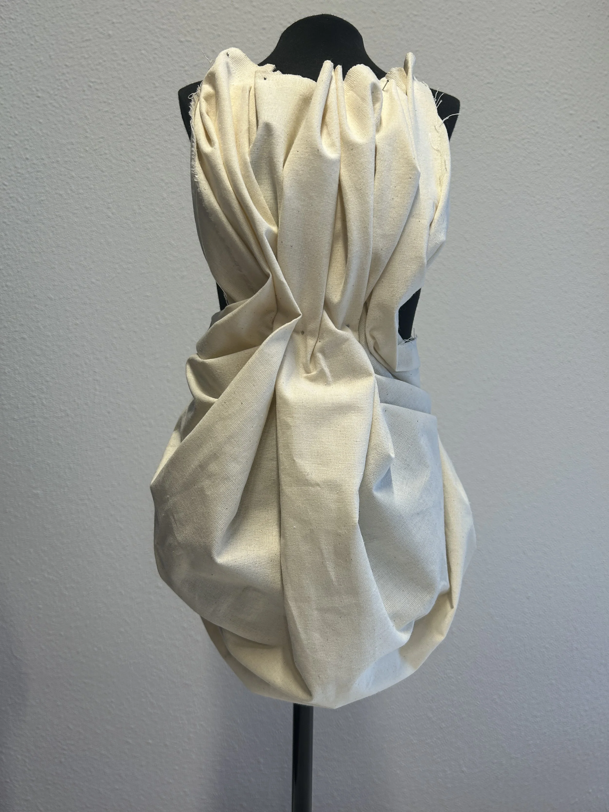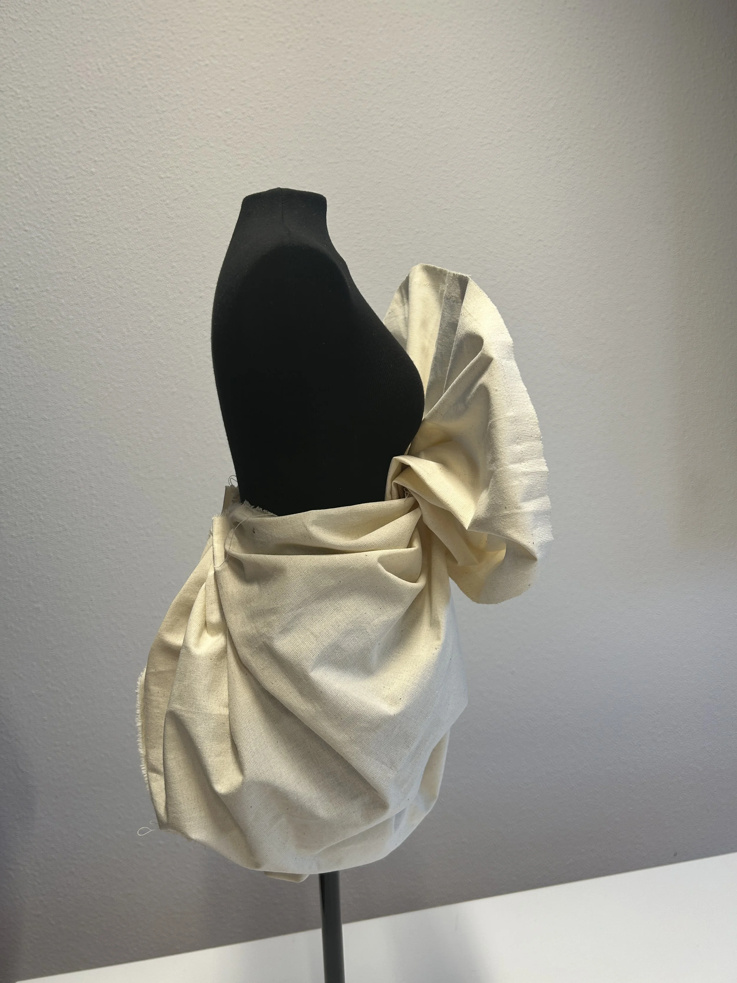In this project, I engaged in experimentation with calico fabric on a half-size mannequin to push my sewing skills to new levels. This hands-on experimentation gave me valuable insights into garment construction, fabric behaviour, and the balance between functionality and aesthetics.